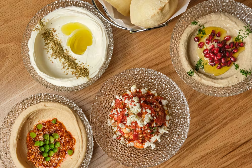 We always begin with the spreads. Think cool labneh and creamy hummus, paired with pita so warm it’s still steaming. It’s the ultimate way to open the palate.